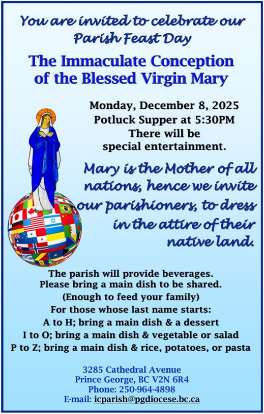- Baptism: Call or email or Parish Office at icparish@pgdiocese.bc.ca or email Fr. John Garden at jgarden@pgdiocese.bc.ca